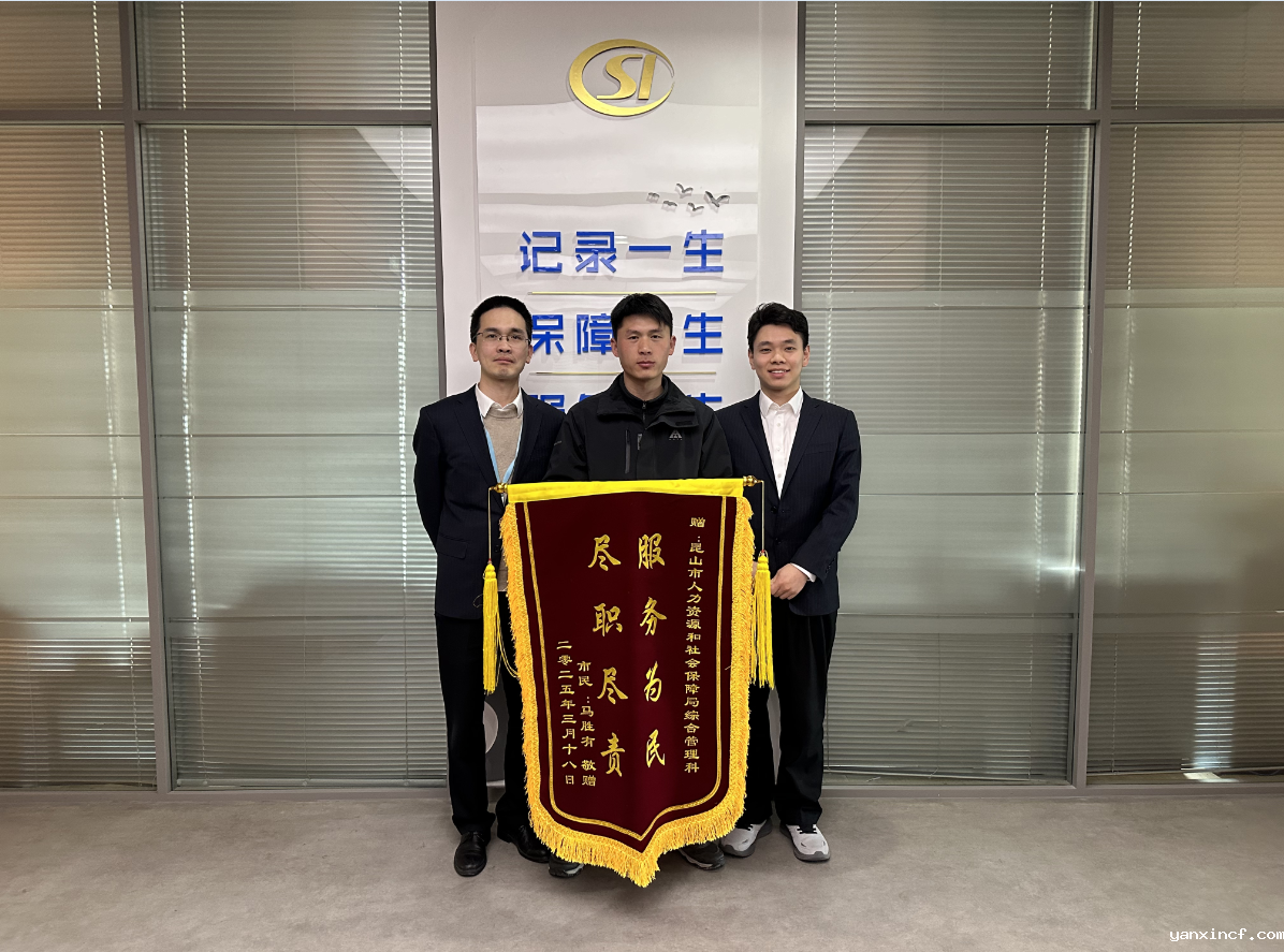 近日,市民马先生专程前往昆山市社保中心,将一面印有“履职尽责,服务为民”的锦旗送到工作人员手中,对社保中心综合管理科高效解决其社保争议表示诚挚感谢,对社保争议处置团队工作人员用心用情为民解忧的服务态度给予高度赞扬。