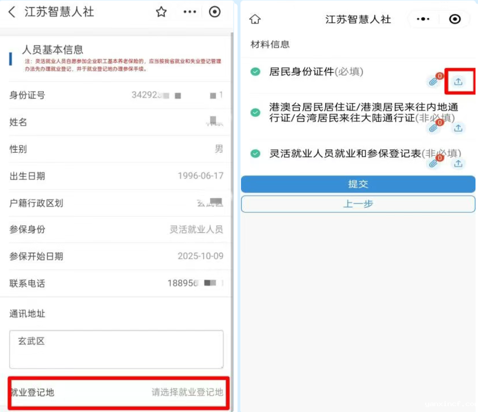 办理渠道: (一)线下方式 灵活就业人员就业登记和养老保险登记业务实行统一办理。本市户籍人员携带身份证、户口簿至户籍所在社区人社工作机构,常住人员(含省内非本市户籍人员、外省户籍人员和港澳台居民)携带身份证、居住证至居住地所在社区人社工作机构,办理灵活就业人员就业申报与养老保险参保登记。 (二)线上方式 可通过“江苏智慧人社”手机APP、“江苏智慧人社”微信和支付宝小程序、“江苏省人力资源和社会保障厅网上办事服务大厅”网上办理。 Tips: 也可以通过新业态灵活就业线上参保一站式服务试点平台办理哦!目前已有6个参保渠道(“米立伙伴”“零工巧匠数智就业平台”“苏心生活”微信小程序、“中国电信”“德善辛庄”“智灵犀灵工平台”微信公众号) 如何通过“江苏智慧人社”办理灵活就业人员参保请看过来~ 1.打开“江苏智慧人社”支付宝小程序,点击“我的”进行实名认证登录。 2.点击下方“服务”按钮。 3.依次选择“社会保险”——“企业职工基本养老保险”——“灵活就业人员就业和社会保险登记”。 4.核对“人员基本信息”,选择“就业登记地”,上传身份证材料完成后,点击“提交”,显示“提交成功”,即为业务办理完成。、