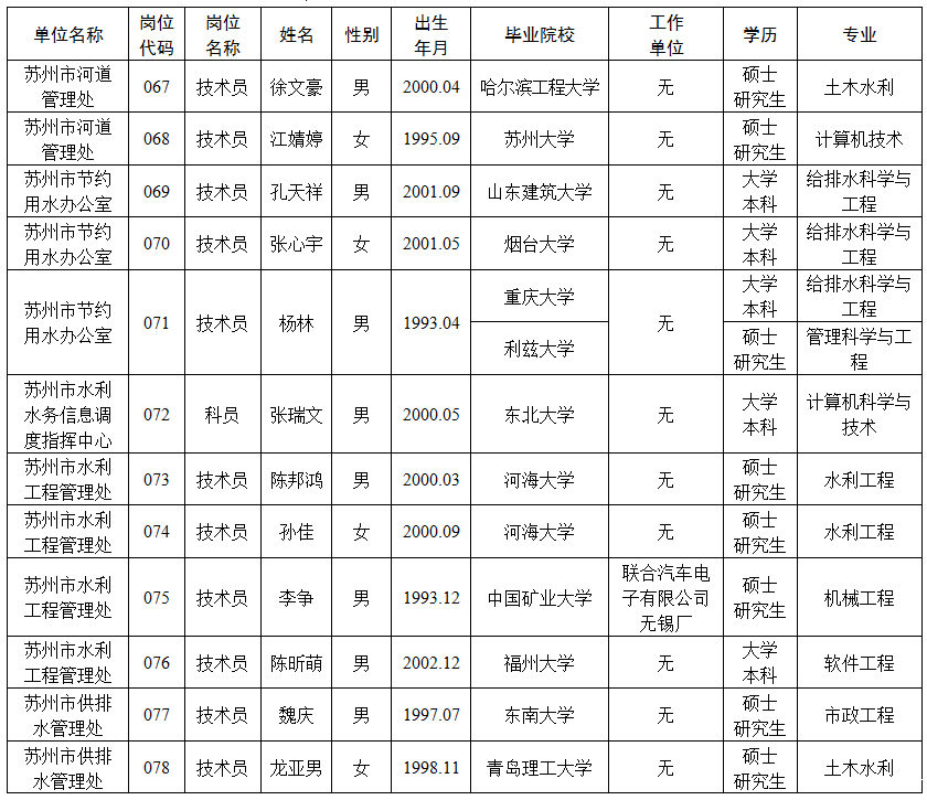 苏州市水务局下属事业单位2025年公开招聘工作人员录用公示